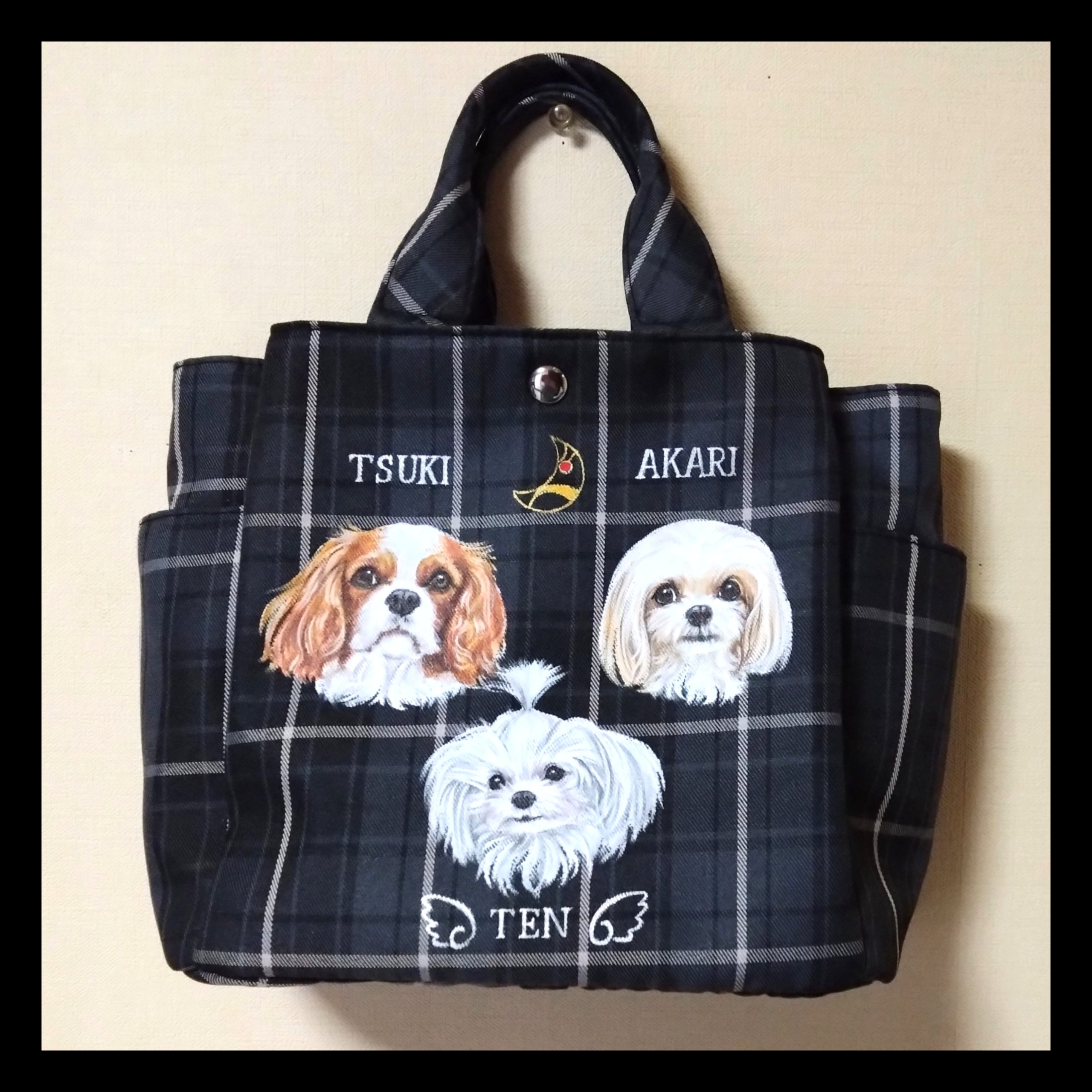 お持ち込みバッグに3ワンを描かせて頂きました。数枚のお写真の中からお客様がお気に入りのお洋服を着たお写真が・・真ん中の子のお顔が隠れてしまっていて・・・ということで、他のお写真で観んなのお顔がちゃんと見えるお写真を元にお顔を描き、お洋服はお気に入りのピンクのお洋服で描かせて頂きました(^_-)-☆手描きなので、こんな事も大丈夫❣