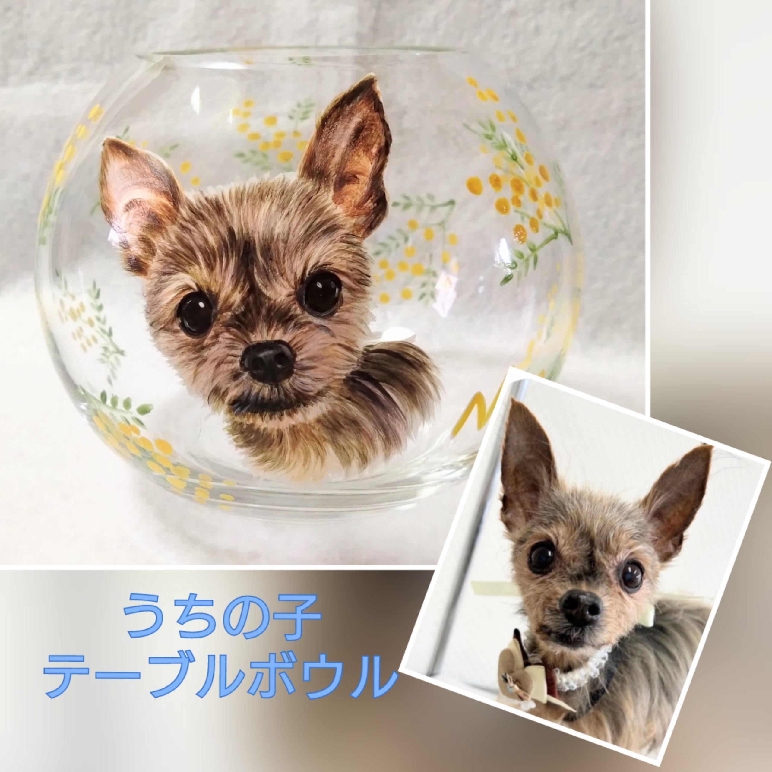 ちょっと大きめのガラスボウルにペットの似顔絵を描かせて頂きます。写真は桜の花を一面に描いておりますが、ご希望に合わせて他の絵をお入れすることも出来ます