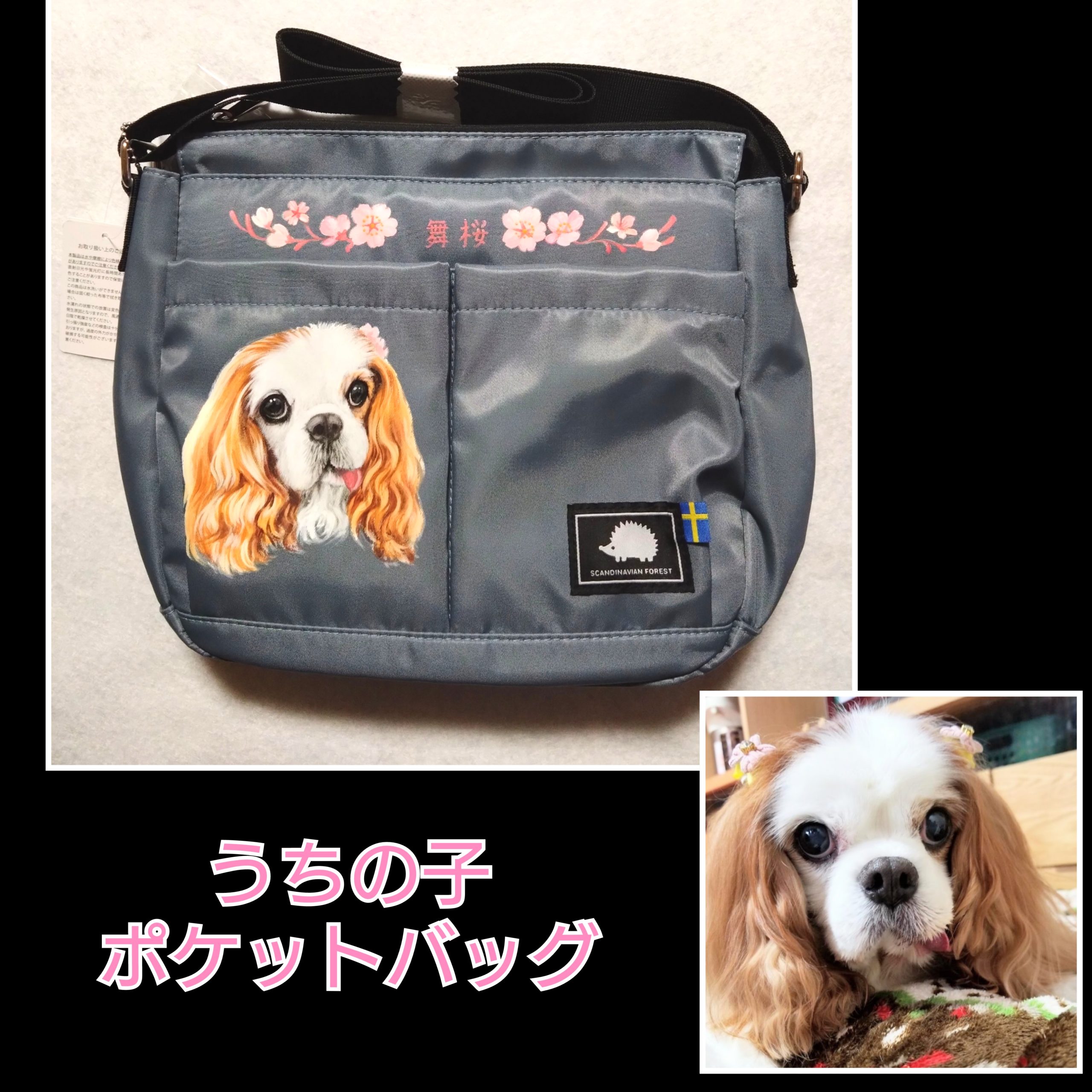 こちらの作品はブラックのキャンバスバッグに笑顔の可愛いキャバリアちゃんの似顔絵を描かせて頂きました 優しいお顔なのでネーム部分のハートを桜色で描かせて頂きました。飼い主様は このバッグを持ってお花見にお出かけされたとのことでした🌸(*^-^*)