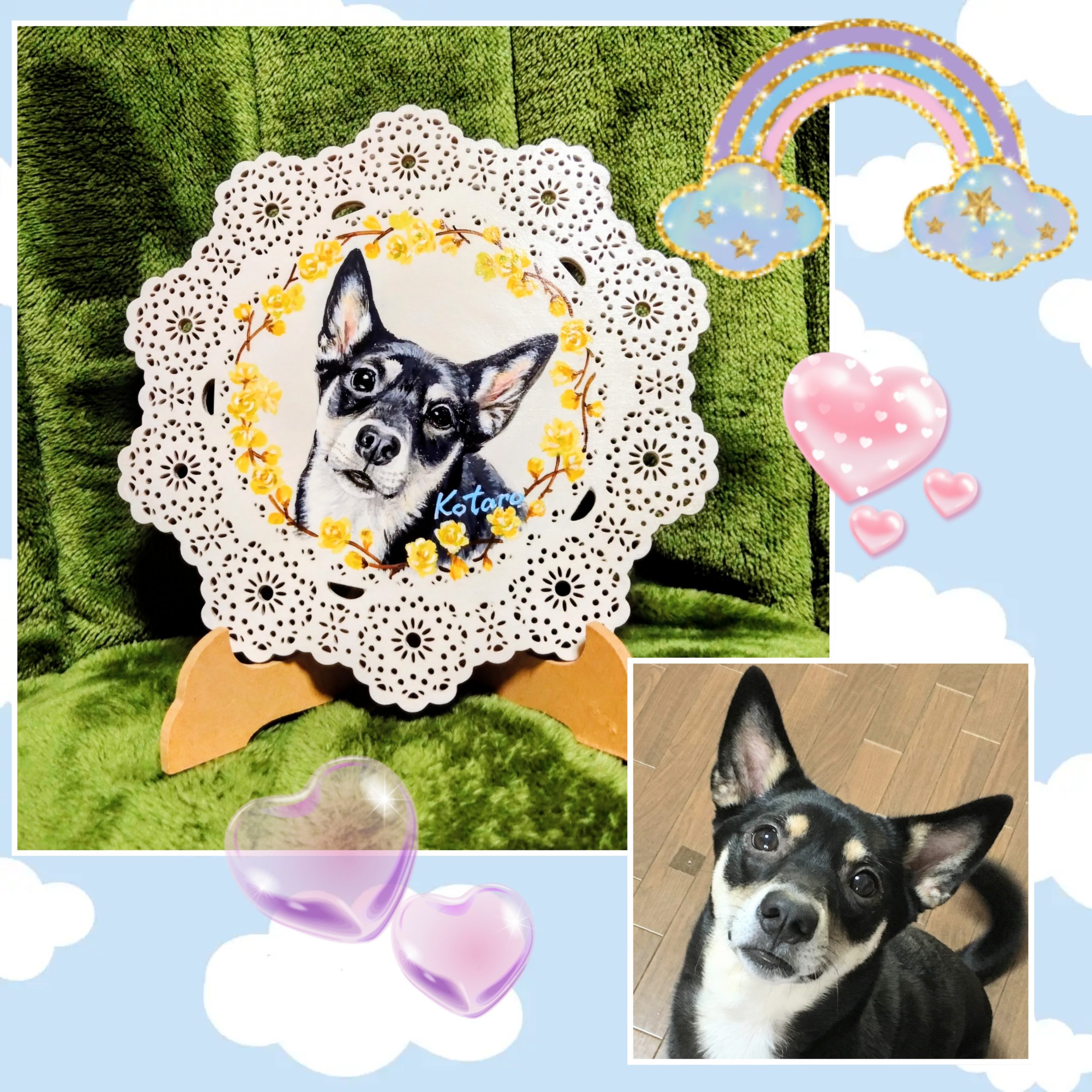 お散歩が好きで、草を食べて楽しんでいるので、道端に有る小さな花を飾り画に入れて欲しいとご依頼を頂きオオイヌノフグリを散らしてシンプルな飾り画にしてみました。うちの子の似顔絵が付いたポシェットを持って歩くと、きっとワン友さんとの会話も弾みますよ🐾🌼