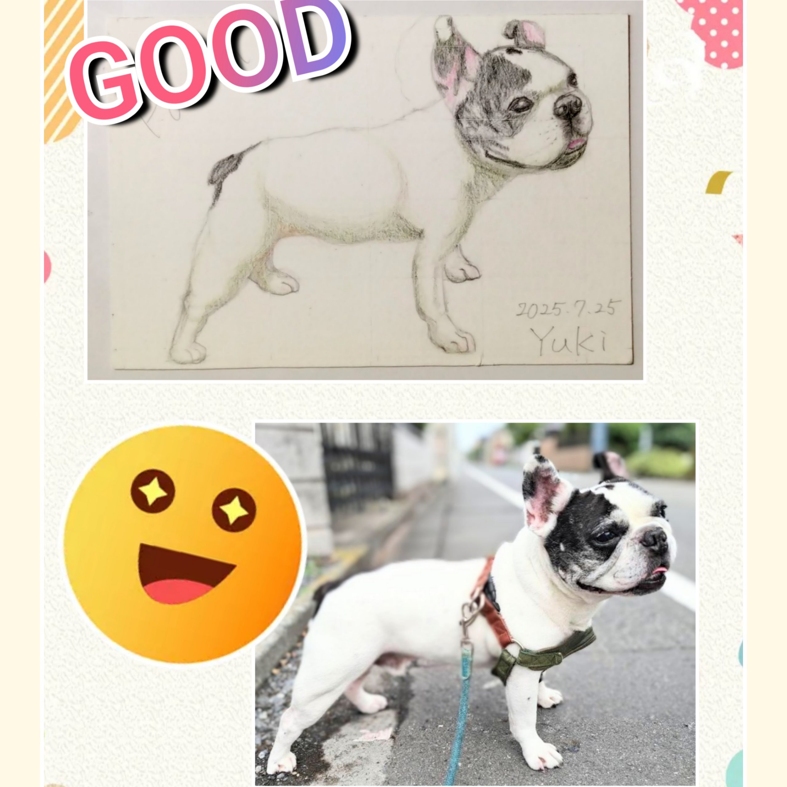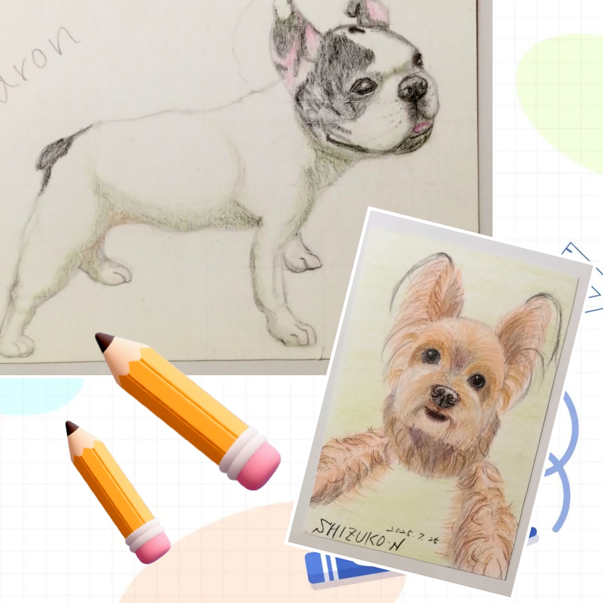 今回、フレブルちゃんは全身画、ヨーキーちゃんは前回の続きで前足部分の完成をテーマにレッスンしました。お二人とも完成出来て良かったです(*^-^*)サイズはハガキサイズ、画材は色鉛筆です。白い部分が多いフレブルのパロン君、影を入れることで身体の立体感を表現することを勉強しました。ヨーキーのムック君の前足は毛並みのフワフワ感の表現を勉強しました