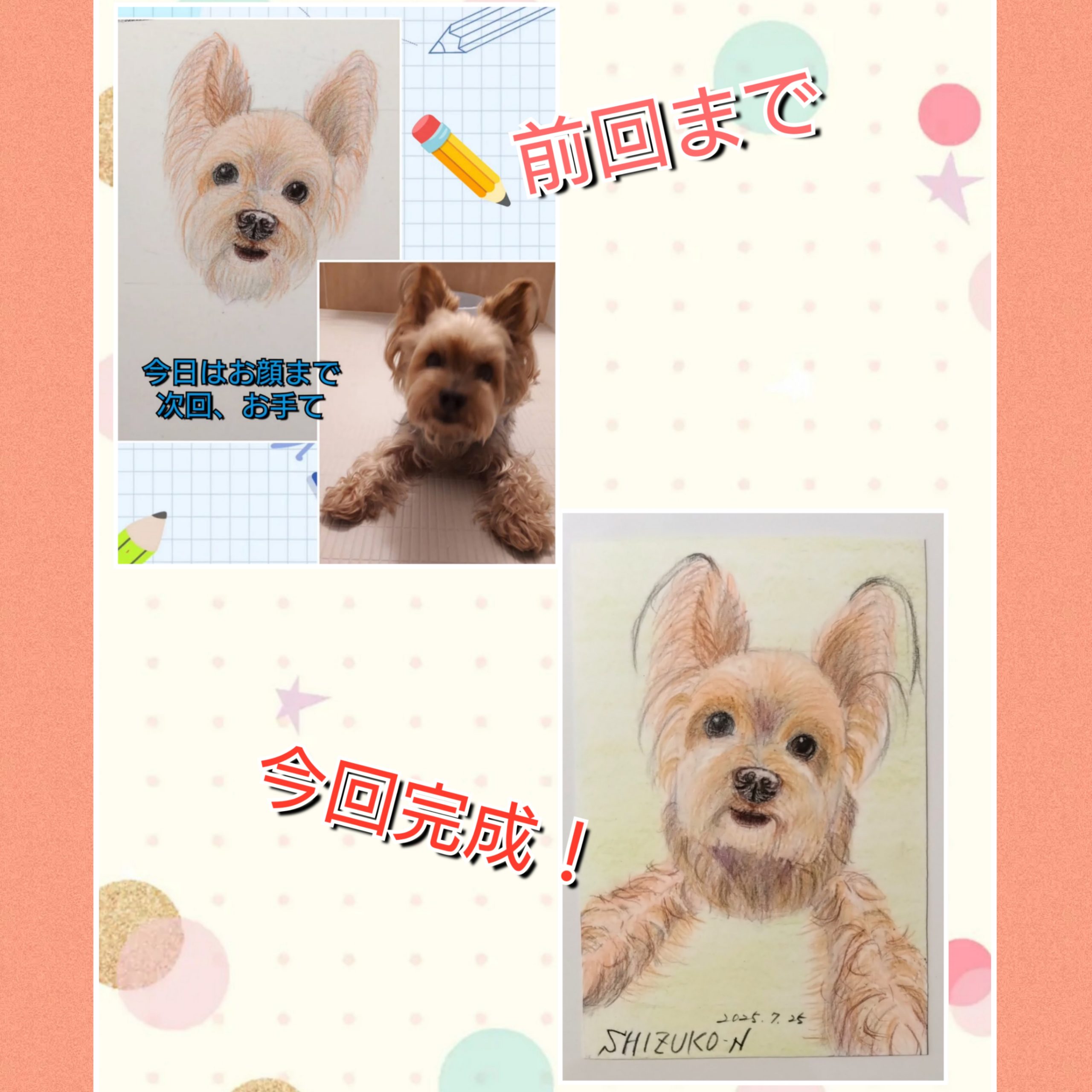ヨーキーのムック君は、前回お顔まで描いて終わりましたので、今回は前足を描き込んで仕上げて貰いました。注意点は、毛並みに隠れている足の肉体をしっかり把握したうえで毛を描き込んで頂く事を学んで頂きました。こちらも、しっかり理解して下さって、見事な作品に仕上げて下さいました(^_-)-☆