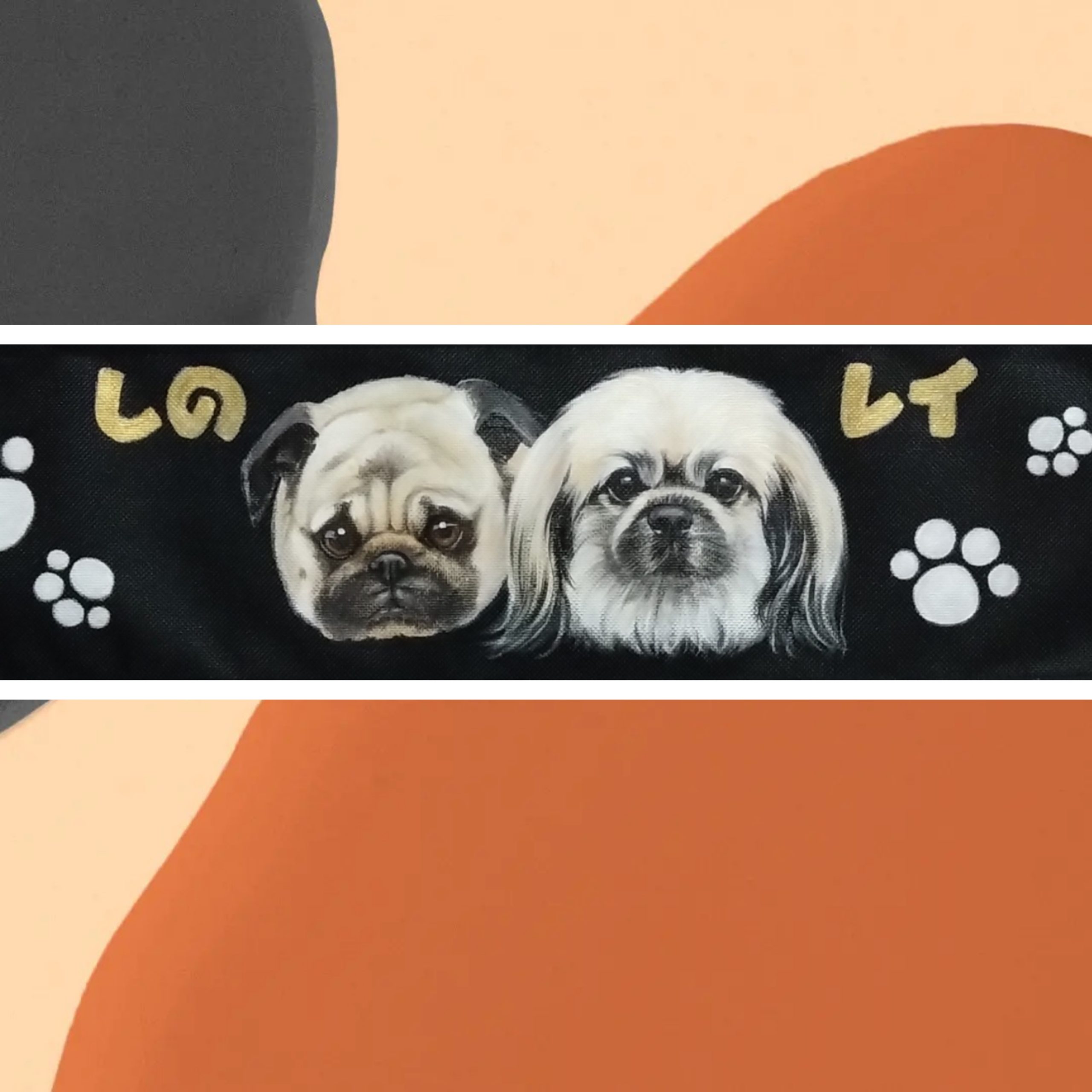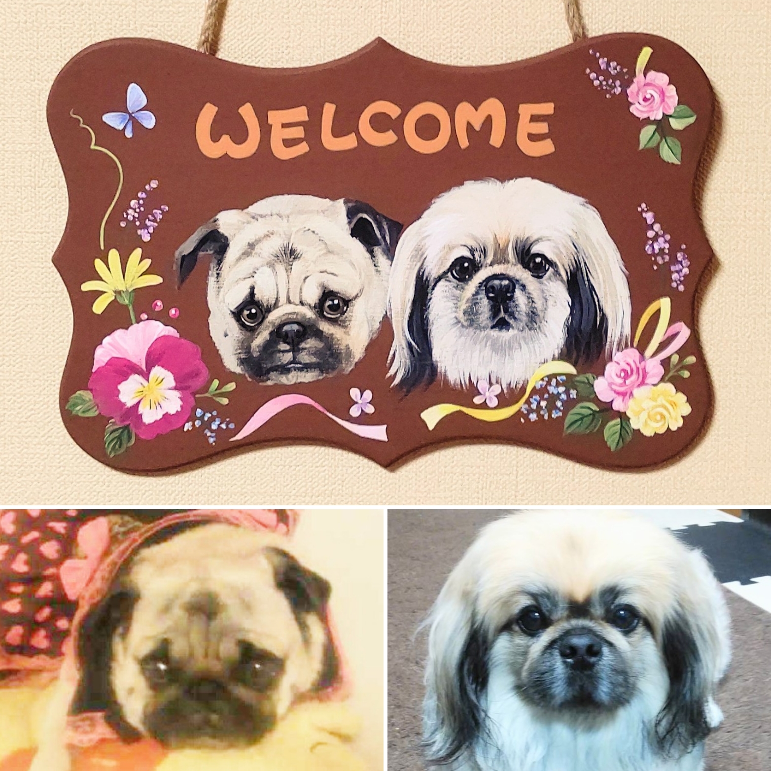 以前、ウェルカムボードに描かせて頂いたレイちゃんとしのちゃんのお顔で今回はレイちゃんの新しいカートカバーに似顔絵を描いて「レイちゃんカート」になりました~~~(^_-)-☆パグのしのちゃんは先代犬さん・・・今はお空でゆっくりしていますが、パパさん、ママさんにとっては大事な家族💖だから、ウェルカムボードも、今まで使っていたカートも・・全部二人の絵を描かせて頂きました。