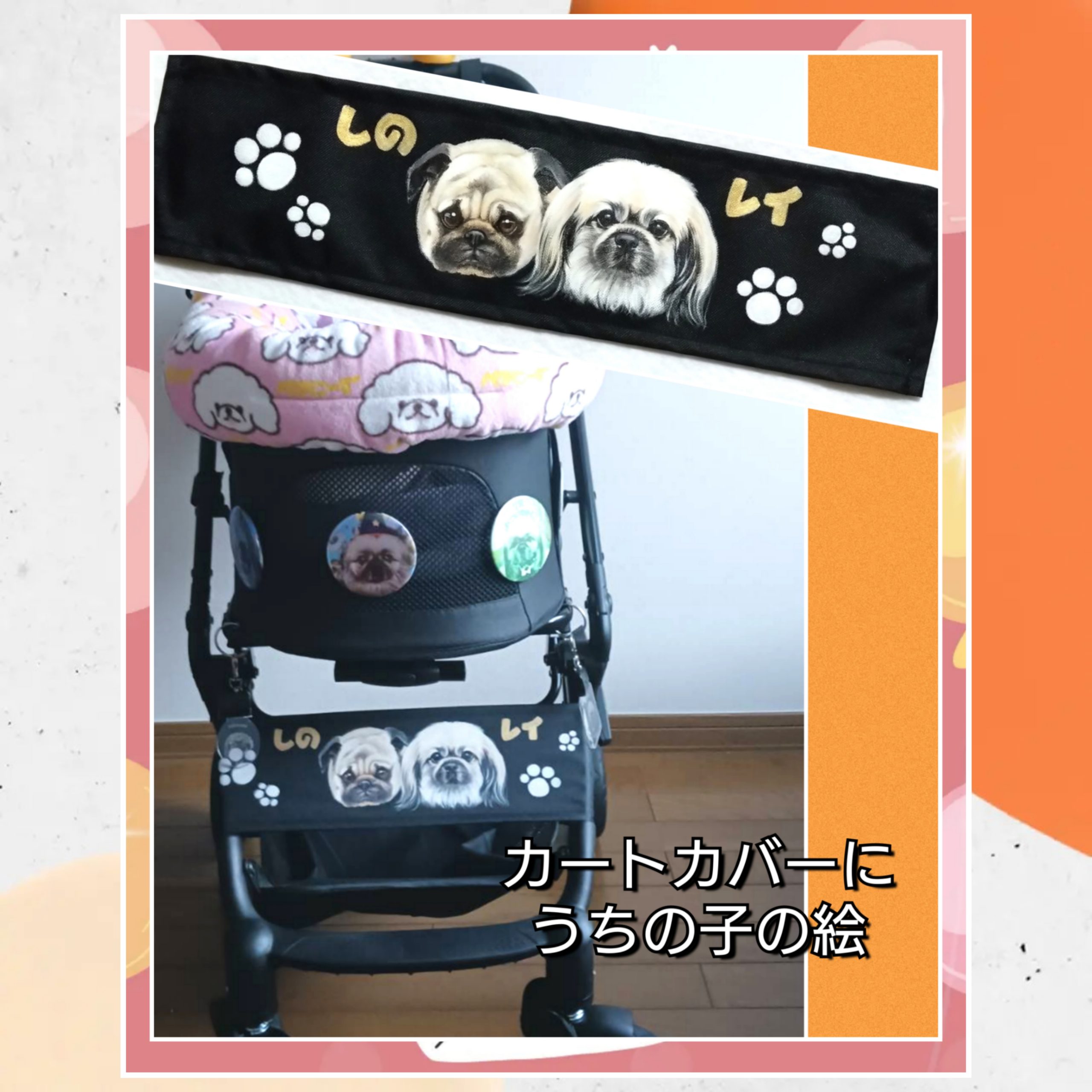 ご近所のペキニーズ、レイちゃんの新しいカートが「レイちゃんカート」に変身❣先代犬のしのちゃんも一緒だよ~❤❤カートカバーをお預かりして、レイちゃんとしのちゃんの似顔絵を描いてお渡ししました。カートにセットされたお写真を頂きました(*^-^*)喜んで頂けて良かったです