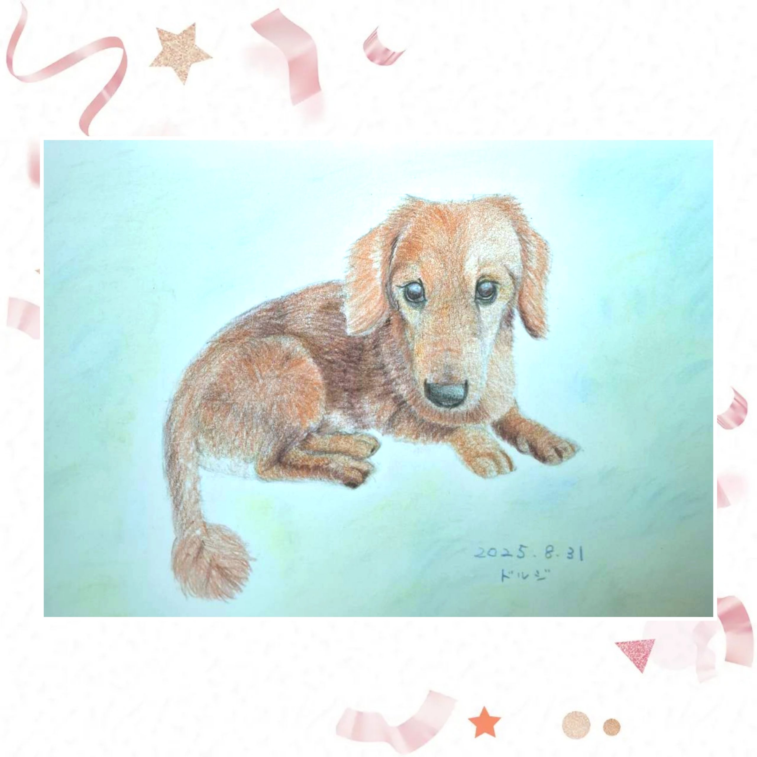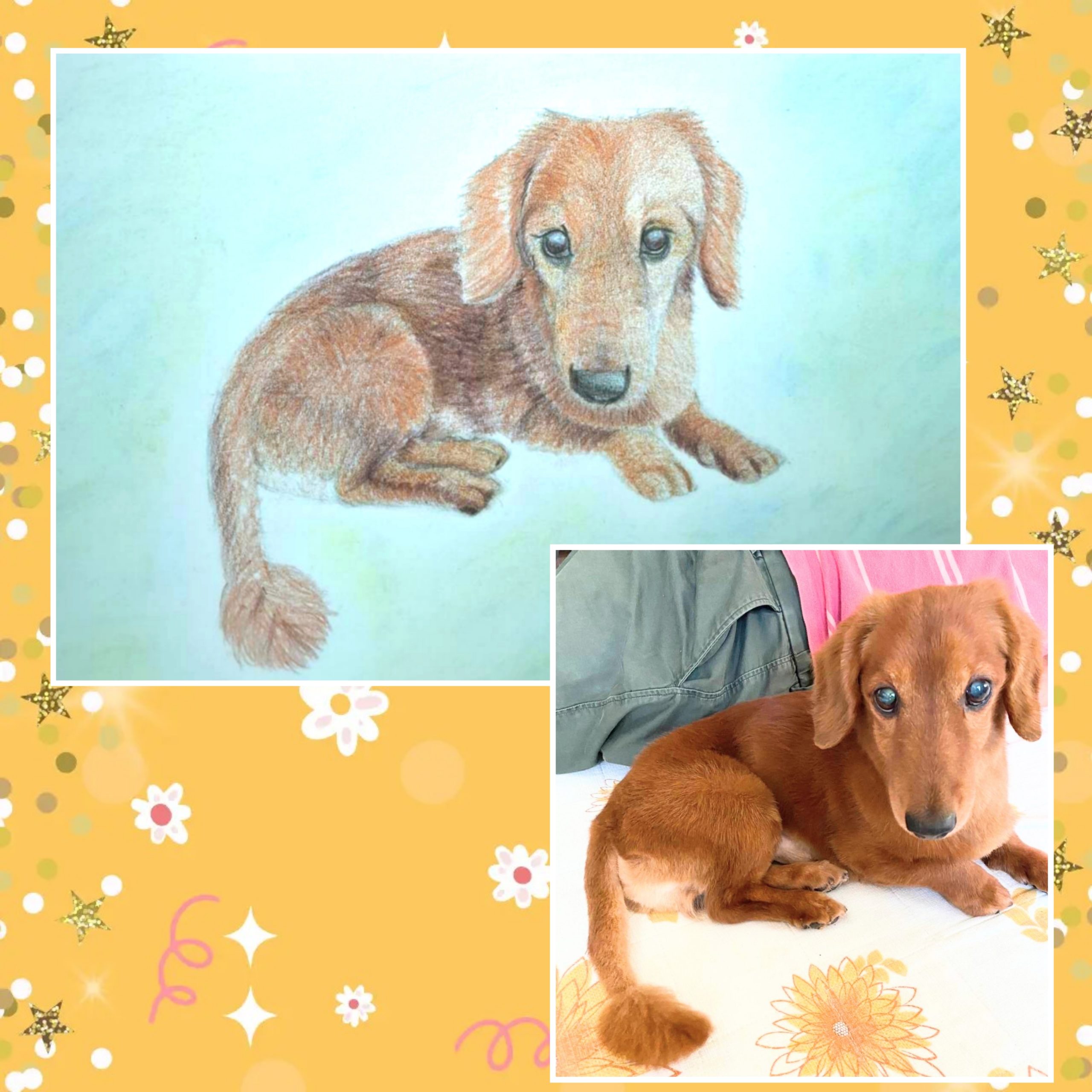 テーマは全身のペット画を色鉛筆で描く。今回提供されたお写真は、ダックスちゃんでちょっと難しいポーズのお写真でしたので、一日目では完成出来ず、二日目で完成❣二日眼は仕上げだったので、足先の描き方を特に勉強しました。犬や動物の足先は難しいんですよね(;´・ω・)頑張って描いてくださいました