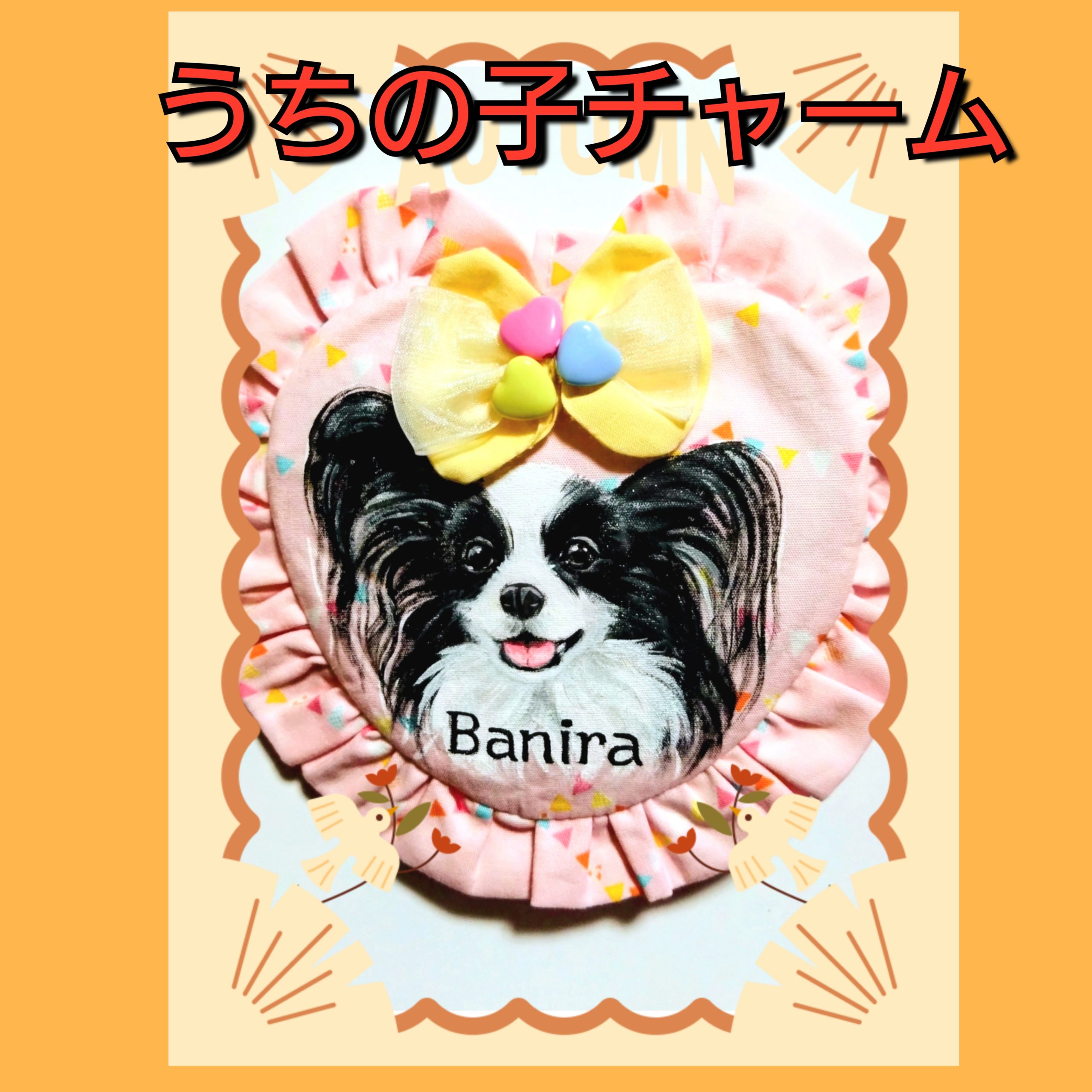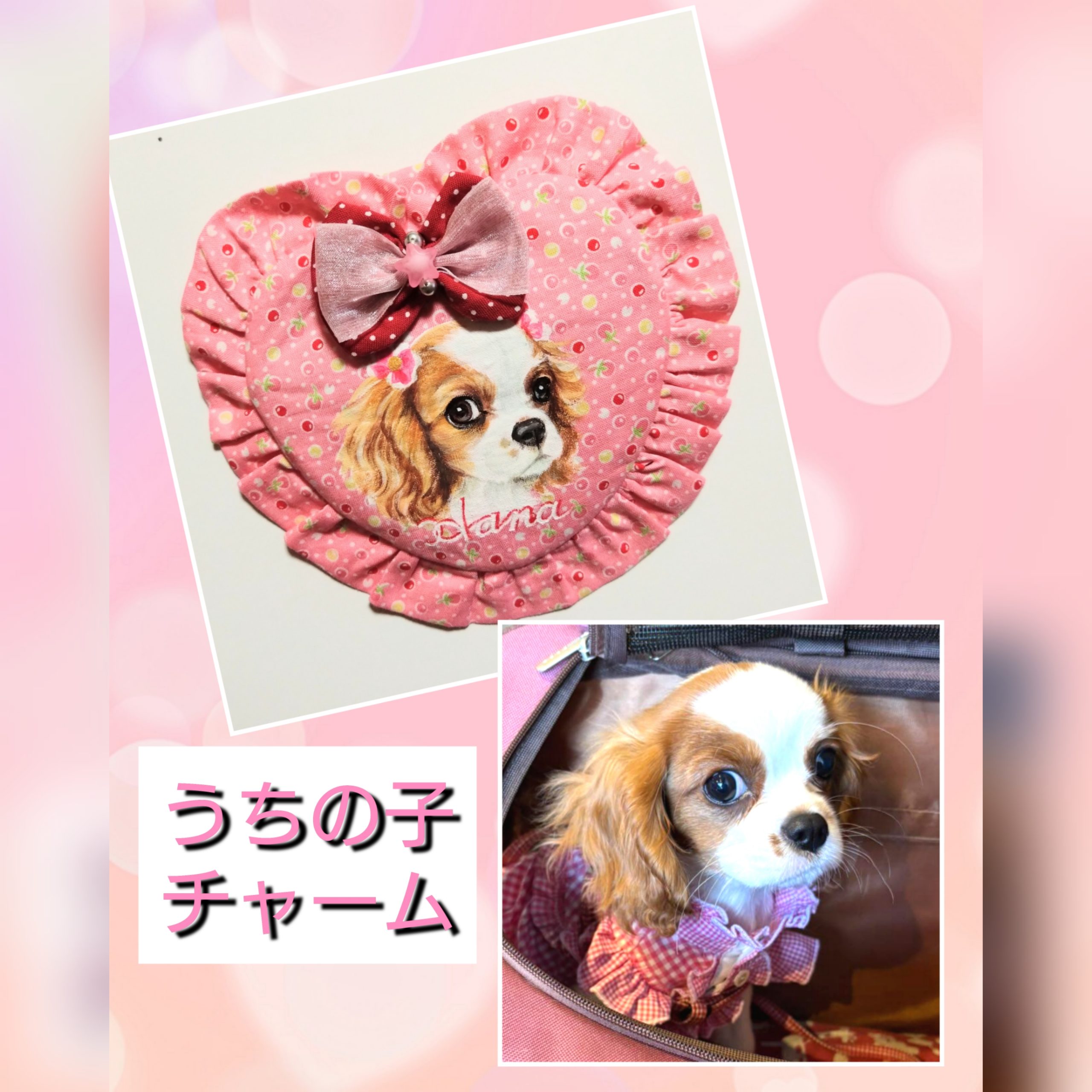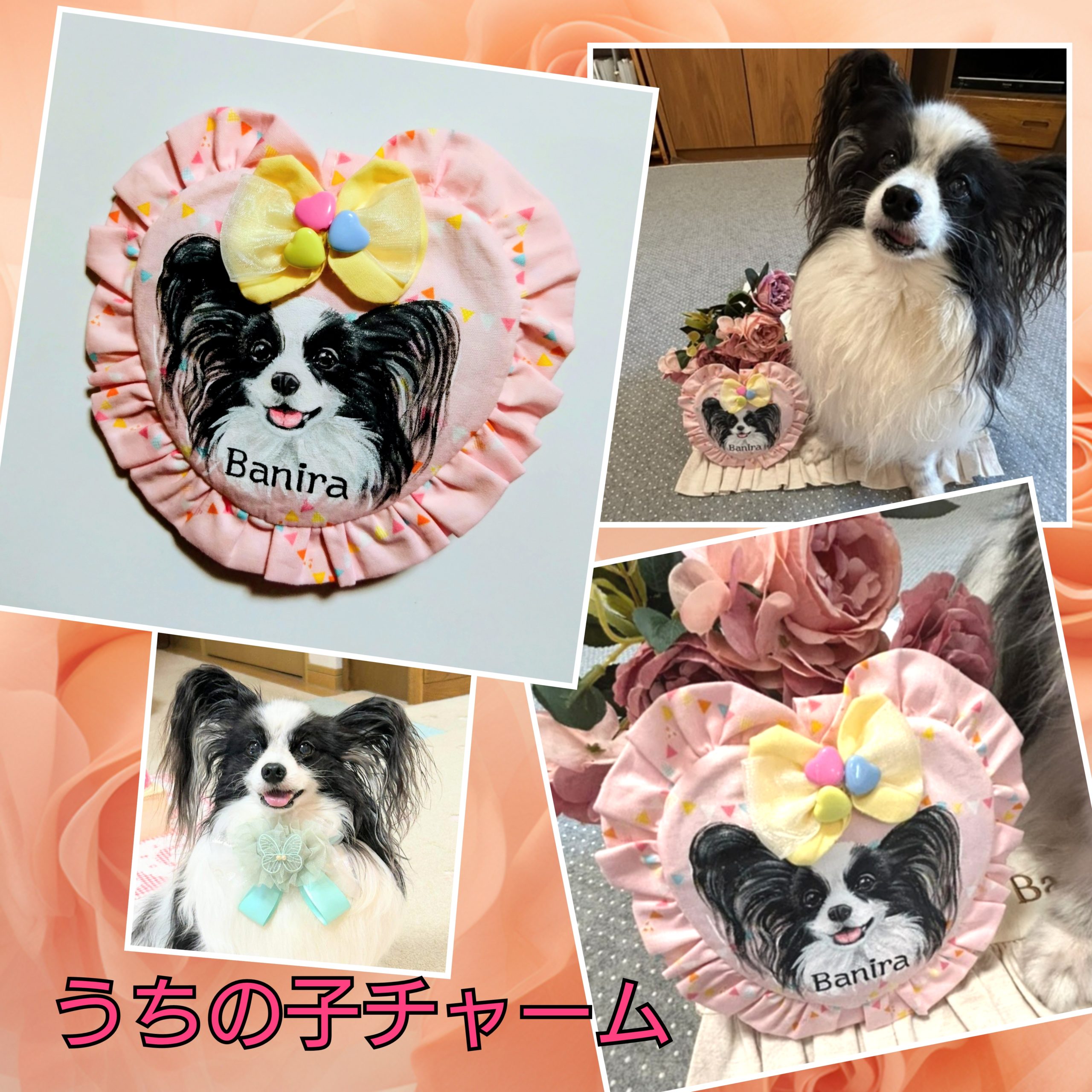 パピヨンのバニラちゃんの「うちの子チャーム」💖お耳と真ん丸お目めと面長のお顔が特徴のバニラちゃん、ママさんから本犬バニラちゃんと一緒のお写真を頂きました(・∀・)淡いピンクのチャームに黒と白のバニラちゃんがとっても映えて、このピンクを選ばれたママさん・・さすがです(*^-^*)
