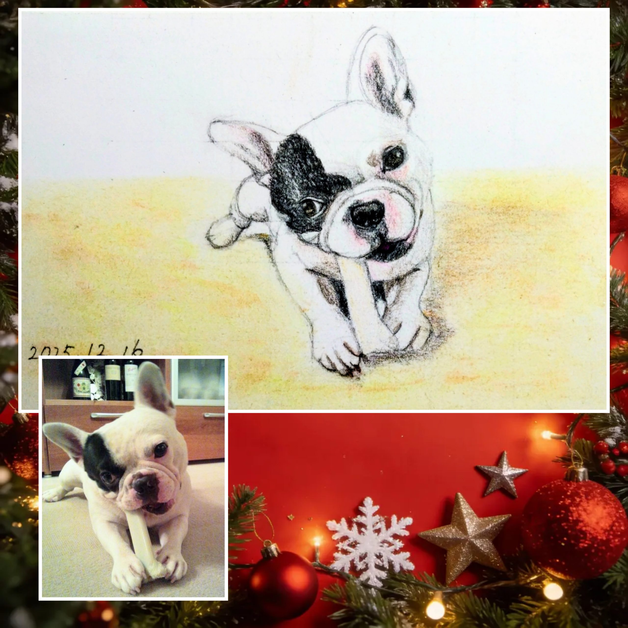 今年から始めたペット画レッスン・・半年でここまで描けるようになりました(*^-^*)4歳でお空に逝ってしまった先代犬ちゃんの似顔絵。今回は骨を咥えた可愛いお写真を元にレッスンしました。大分お一人で描けるようになりました❣!来年も頑張りましょう